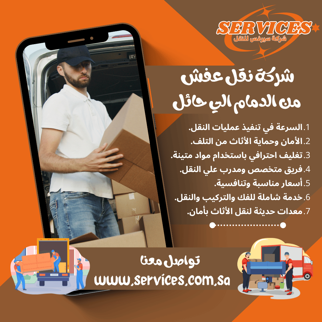 نقدم في شركة نقل عفش من الدمام خدمات متنوعة من نقل العفش الخاص بمختلف الفنادق المدارس المستشفيات المكاتب وغيرها من المنشآت بالإضافة إلى خدماتنا المميزة في نقل الأثاث المنزلي بمنتهى الدقة والكفاءة، بالإضافة إلى هذا فإننا نقدم خدمة تغليف عفش على أعلى مستوى وتقدم هذه على أيدى فنين مدربين على كيفية التغليف المناسب لكل قطعة تقوم شركتنا بنقلها بما في هذا القطع الحساسة والباهظة، من خدماتنا أيضًا إصلاح العفش حيث يقوم طاقم النجارين بمعاينة العفش قبل الفك وإن كان هناك أي قطعة أثاث بحاجة إلى صيانة فإنه يصلحها لك بدون تأخير كما نوفر حسب الطلب فنيين لنقل الأجهزة المنزلية وإصلاح أي عطل بها أيضًا، مع شركة نقل عفش من الدمام لحائل يمكن تخزين عفشك بدون القلق عليه وذلك لإن لدينا أكثر من مخزن لتخزين الأثاث والأجهزة المنزلية، ماذا تنتظر تواصل مع شركتنا لتحصل أيضًا على خصومات وتأمين.